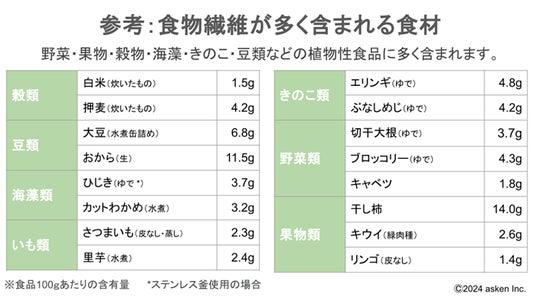 なお、厚生労働省「日本人の食事摂取基準(2020年版)」によると、食物繊維の目標量(1日)は男性21g以上、女性18g以上(18~64歳の場合)と示されています。