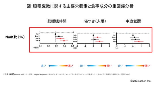 また、本調査からは、Na/K比が高いグループに、睡眠の悪化(睡眠時間が短くなり、寝つき(入眠)までの時間が長くなり、中途覚醒が増加する)が認められました。Na/K比とは塩分(ナトリウム)と野菜等(カリウム)の摂取バランスを表す指標であり、ナトリウムが少なく、カリウムが多い(=Na/K比が低い)食事を心がけることで、高血圧の予防や改善が期待できます。今回の研究から、Na/K比が1.8以上のグループは、Na/K比の値が最も低いグループと比べて、総睡眠時間が約11分短く、寝つき(入眠)が約1分以上遅くなり、中途覚醒が約0.7%増加することも示されました。