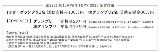従来のJCI JAPAN TOYPより対象年齢を拡げることによって、若く柔軟な発想や活動を社会に拡げ、あらたな社会への好循環を生み出します。こちらも活動支援金及び、各企業とのマッチングを副賞として贈呈いたします。