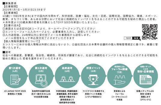 公益社団法人日本青年会議所は、2025年1月1日より本年で第39回を迎える「JCI JAPAN TOYP 2025」事業のエントリー募集を開始いたしました。