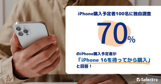 例年通りであれば2024年9月に新型となるiPhone 16シリーズが発表、発売されます。新型iPhoneの発売まで2か月を切った今、セレクトラ・ジャパン株式会社(東京都渋谷区、代表取締役:グザビエ・ピノン)では、2024年6月27日から2024年7月4日にiPhoneの購入を予定している男女100名を対象に独自のアンケートを実施しました。
