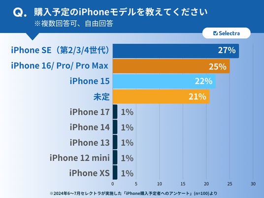 購入予定機種はiPhone SEシリーズが約27%で最多、新型iPhone 16シリーズ購入予定者は約25%