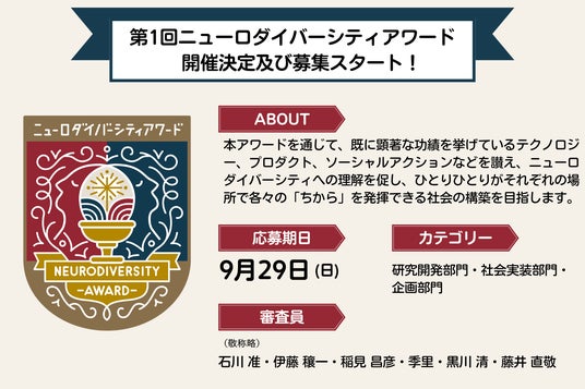 ニューロダイバーシティへの理解を促し、ひとりひとりがそれぞれの場所で各々の「ちから」を発揮できる社会の構築を目指し、第1回ニューロダイバーシティアワードを開催します。ニューロダイバーシティの普及は、新たな創造性を引き出し、社会全体の発展に繋げることができます。本アワードを通じて、既に顕著な功績を挙げているテクノロジー、プロダクト、ソーシャルアクションなどを讃え、ニューロダイバーシティに対する理解をさらに深めるとともに、社会における多様性と包摂性を推進するための新しい道を切り開くことを目指します。