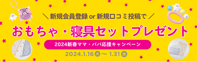 2024年に新しくママ・パパになる方を応援することを目的としたプレゼントキャンペーンを実施します。新規会員登録または新規口コミ投稿をしていただいた方を対象に、プレゼントが抽選で当たります。