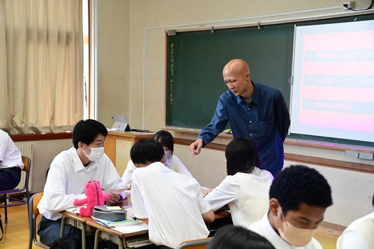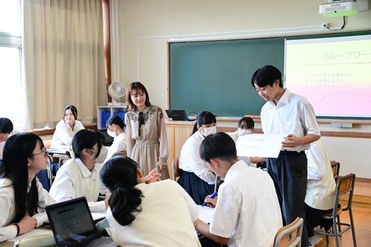 出張授業の様子。グループワークの様子を見守る大坪代表