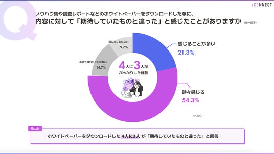 アイコネクトが独自に行った調査によると、ホワイトペーパーをダウンロードした際に、4人に3人(75.6%)が「期待していたものと違った」と回答しています。ダウンロード側とのミスマッチを解消するには、提供するホワイトペーパーのコンテンツ改善が求められます。