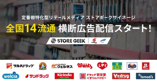 株式会社ストアギーク(本社:東京都港区、代表者:代表取締役 廣瀬 隆昌、以下「ストアギーク」)は、リテールメディアサービス「ストアギークサイネージ」が新たに大手ドラッグストアチェーンである中部薬品株式会社(本社:岐阜県多治見市、代表者:代表取締役社長 高巢 基彦、以下「中部薬品」)と株式会社トモズ(本社:東京都文京区、代表者:代表取締役社長 角谷 真司、以下「トモズ」)で導入開始されましたので、お知らせいたします。