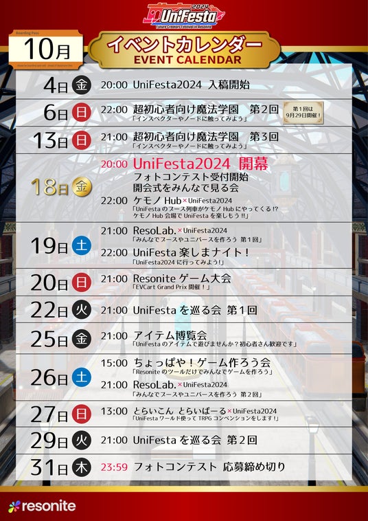 最先端のソーシャルVRプラットフォーム「Resonite」にて、未来のクリエイターフェスティバルUniFesta2024を開催いたします。入稿期間が10月4日から11月7日まで、開催期間が10月18日から11月8日までとなっており、会期と並行して入稿が行われることで順次出展物が増えていく形式となります。