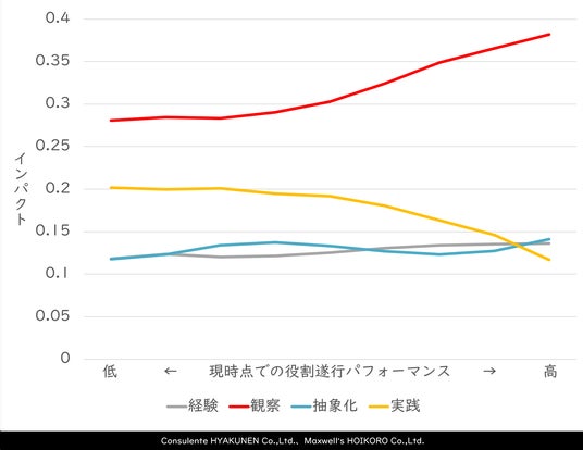 赤色の線は、経験学習のうち、「観察」を表しています。この赤色の線が右上がりになっていることが分かると思います。これはつまり、経験学習の「観察」のステップが持つ人材育成に対するインパクトが、「どんどん強くなっていく」ことを示しています。ここでの「どんどん強くなっていく」とは、「ある社員が役割遂行できるようになればなるほど、『観察』の重要さが高まっていく」ということを意味します。赤色の線の一番左端は、「現時点での役割遂行パフォーマンス」が「低」い状態です。より具体的には、期待された役割をまだ果たせない状態にある社員を示しています。そういった社員にとって、「観察」が成長に与えるインパクトは、0.3を下回っています。それに対して、赤色の線の一番右端は0.4に近い高さまで到達しており、「現時点での役割遂行パフォーマンス」が「高」い状態です。このことから、決められた役割を果たす能力を身に着けていると認められる社員が、より一層成長するためには、「観察」が大きなインパクトを持つということが分かります。