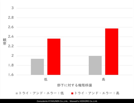 【図3】「観察」(縦軸)が最も高くなるのは、一番右側のグラフです。観察した内容を試す権限を与え、その試行錯誤の中での失敗を許容することで、部下の「観察」が促されます。