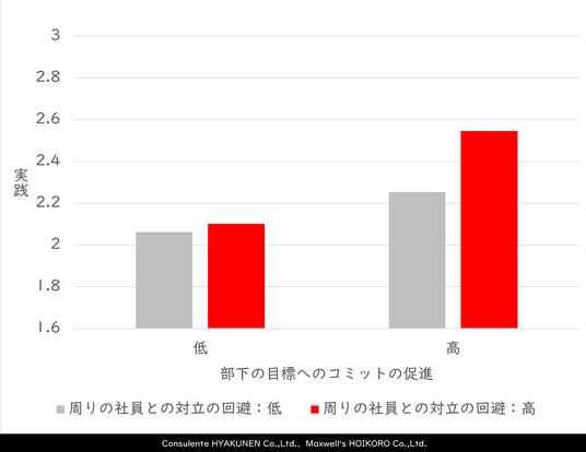 【図2】「実践」(縦軸)が最も高くなるのは、一番右側のグラフです。実践することの目的や目標に対する部下のコミットを高め、彼(女)等が取り組みの中で周りの社員と対立しないようにすることで、「実践」を促すことができます。
