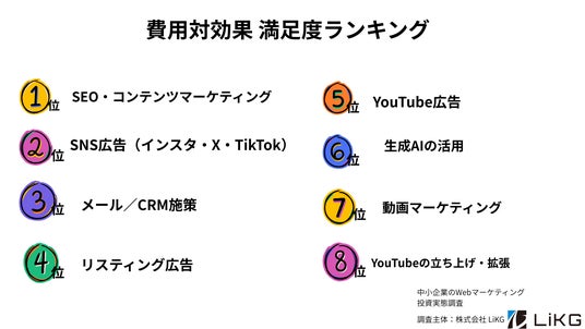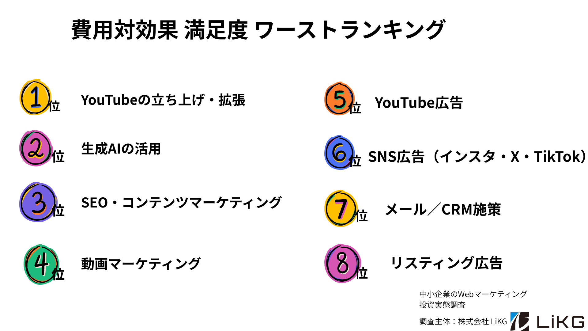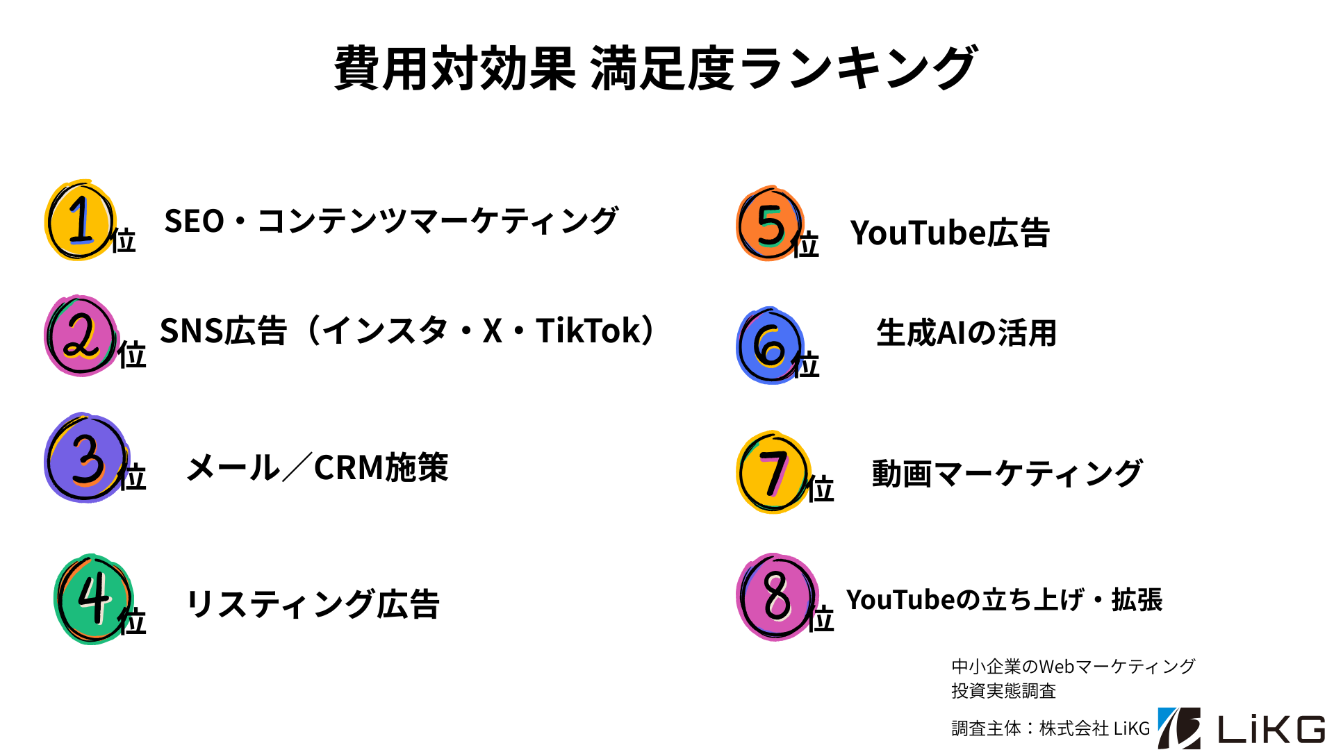 重みづけスコアによる不満度分析では、「YouTubeの立ち上げ・拡張」が最も費用対効果に対する不満が高い施策として際立つ結果となりました。続いて「生成AIの活用」が2位、「SEO・コンテンツマーケティング」が3位に入り、成果の可視化が難しい領域ほど不満が生まれやすい傾向が明らかになりました。一方、同じ調査で実施した“満足度ランキング”では、SEO・コンテンツマーケティングが最も高い評価を獲得しており、同一施策が「最も評価される一方で不満も大きい」という二極化が特徴的です。