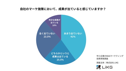 本調査では、58.5%が年間マーケティング予算を100万円未満と回答し、多くの企業が限られた予算規模で施策を進めている実態が明らかになりました。また主要施策としてはSEOやSNS広告が中心となる一方、Webマーケティング施策全体に「十分に成果を実感している」と回答した企業は10.0%にとどまり、多くの企業が成果創出に課題を抱えていることが分かりました。