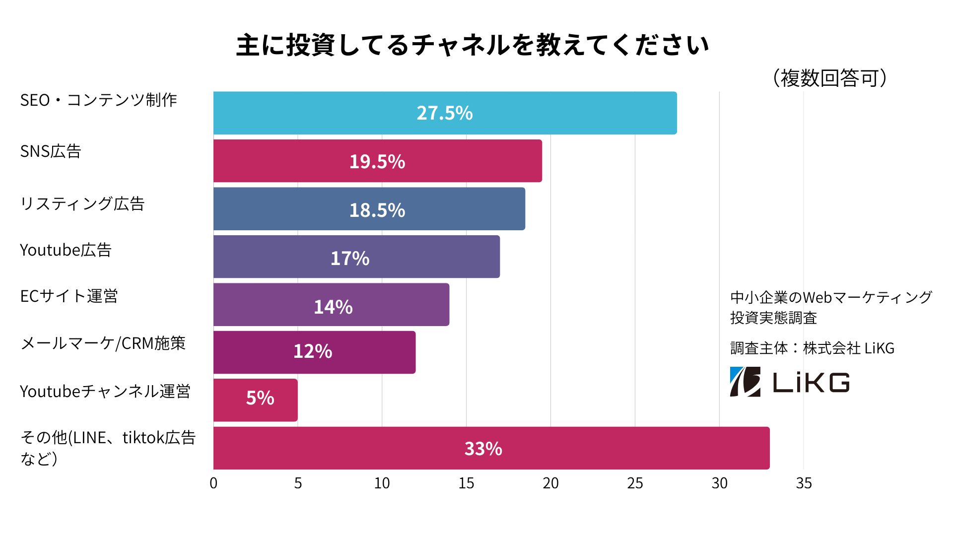 一方で、SEOやSNS広告、動画広告など少額でも成果を積み上げやすい手法も多数存在しており、限られた予算の中で戦略と体制を整え、継続的に改善を行うことで成果創出の余地は十分にあると言えるでしょう。