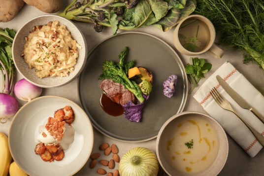 今回の特別コースも、旬の野菜を使った優しい味わいのスープから。滋味深い野菜の風味で胃を整え、この後の料理を迎える体へ。メインディッシュには和牛のフィレ肉を炭焼きでご用意。脂肪が少ないフィレ肉は消化に優しく、必須アミノ酸であるトリプトファンやセロトニンの生成に関わるビタミンB6を含みます。続くリゾットには玄米、雑穀、きのことナッツを使用。いずれも、睡眠の質を向上させるための栄養素を多く含む食材です。デザートには、バナナアーモンドミルクプリンと共に、カフェインを含まない、ホテル自家菜園のハーブを使った優しいハーブティーをご提供します。