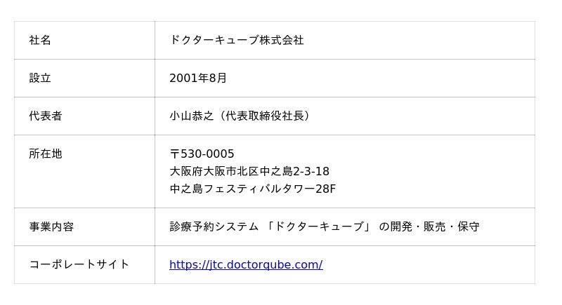 ドクターキューブ株式会社(本社:大阪市北区 https://jtc.doctorqube.com/ )は、診療予約・受付管理に特化した医療機関向けのシステム「ドクターキューブ」を開発・販売・保守を一貫して行う企業です。全国6,400件以上の医療機関に導入をいただいており、医療用予約システムとしてはTOPシェア(※)を誇ります。