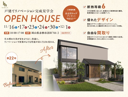 11月16日から、赤磐市(赤磐市沼田766-2)にて開催される本物件の完成見学会では、ベル・ホームのデザインリフォーム「Re・BELLE」のリノベーション技術をご体感ください!