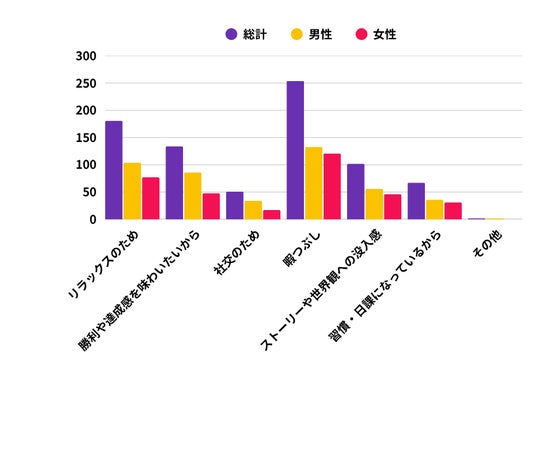 目的は「暇つぶし」(55%)が最多、続いて「リラックス」(40%)、「勝利や達成感」(29%)、「ストーリーや世界観への没入感」(22%)。「暇つぶし」は女性61%、男性52%。「勝利や達成感」を求めるのは男性33%、女性24%。