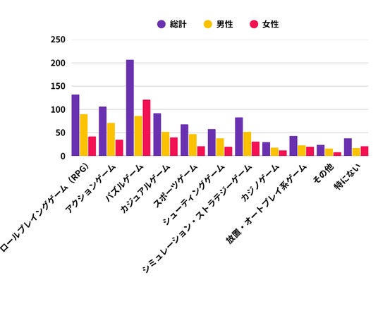 女性はパズルを約61%と圧倒的に好むのに対し、男性はRPG(男性35% 対 女性21%)、アクション(男性28% 対 女性18%)、スポーツゲーム(男性18% 対 女性11%)を女性より好む傾向があります。