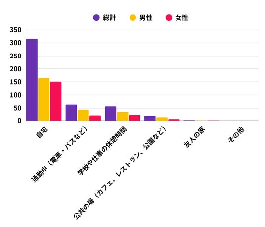 女性は自宅での利用率が約76%と男性の約64%を上回る一方、男性は通勤中が約17%と、女性の約10%を上回っています。