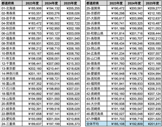 また、47都道府県中46都道府県が月給20万円台に到達し、前年の17都道府県から大幅に増加しました。