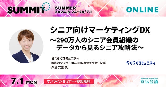 Omelette株式会社(東京都港区、代表取締役 羽野仁彦)は、運営するWEBサイト「シニアマーケティングDX」にて、宣伝会議サミット2024夏 無料オンラインセミナー「シニア向けマーケティングDX~290万人のシニア会員組織のデータから見るシニア攻略法~」の開催を発表いたします。