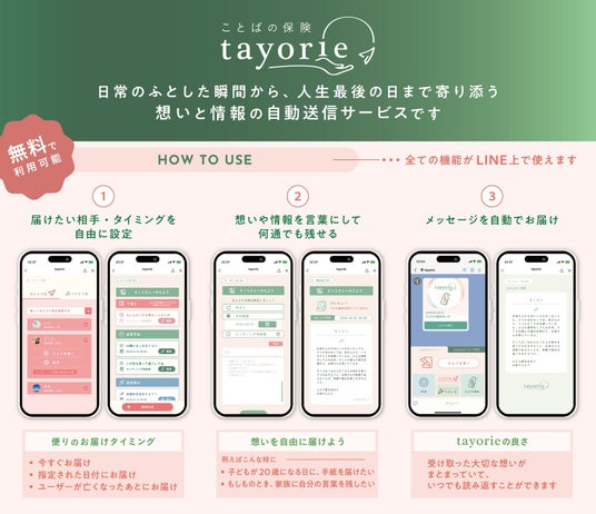 株式会社tayoriが運営する「ことばの保険 tayorie」は、“もしものとき”に備え、大切な人へメッセージや情報を届けることができるWEBサービスです。