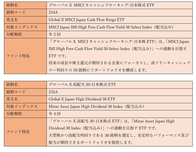 大和証券グループのETF専門資産運用会社であるGlobal X Japan株式会社(東京都千代田区、代表取締役社長 姜 昇浩)(以下、「当社」という)は本日、東京証券取引所より「グローバルX MSCIキャッシュフローキング-日本株式ETF」(234A)と「グローバルX 高配当30-日本株式ETF」(235A)の上場の承認がなされたことをお知らせします。