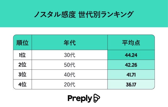 講師とマンツーマンで学習ができるオンライン語学学習プラットフォームを提供するPreply(本社:アメリカ、CEO:Kirill Bigai)は、夏を連想させるワードや懐メロに焦点を当てて、47都道府県の20~59歳の男女400名を対象に『世代別のノスタルジック感度(ノスタル感度)』に関する調査を実施、その調査結果を発表しました。