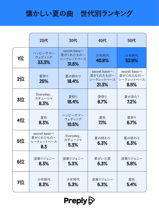 アンケート結果によると、各世代が選ぶ懐かしい夏の曲には違いがあるものの、共通点も見られます。とくに「少年時代」「secret base~君がくれたもの~」「ハッピーサマーウェディング」「夏祭り」は、全世代でトップ10に入るほど人気です。