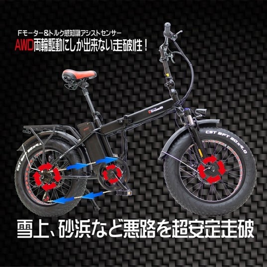 2019年に今までに無いAWD両輪駆動の電動ファットバイクの登場から5年、モーターのトルク配分や日本の道交法基準JIS:D9115規格のアシストセンサー採用やフレームの一部変更など改良を重ねて登場した2024モデルです。今ならSunSun公式OnlineShopにて55%OFF