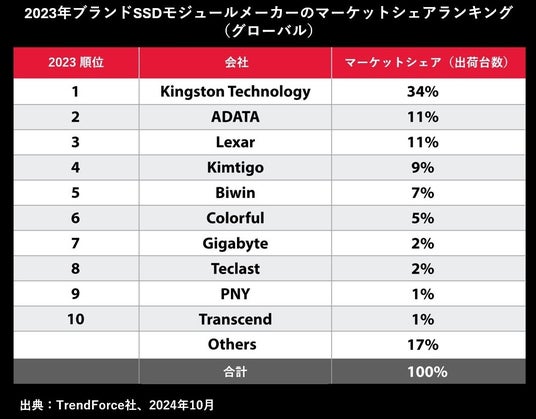 台北 - 11月5日, 2024 -メモリ製品およびテクノロジーソリューションにおける世界的リーダーであるKingston Technologyは本日、調査会社TrendForceの最新の報告を受け、2023年においても7年連続でチャネル市場でのSSDのサードパーティサプライヤーとして首位の座を維持したことを発表しました。TrendForceの調査データによると、2023年のKingstonの市場シェアは出荷台数全体の34%を占めました。