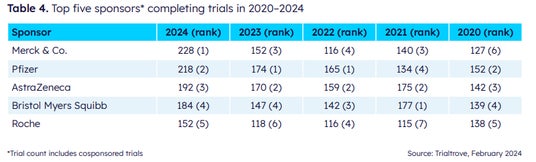2024年における完了試験数の上位5社は、いずれもトップ20製薬企業に該当しており、中でもMerck & Co.は過去最多となる試験数を記録し、初めて首位に立ちました。