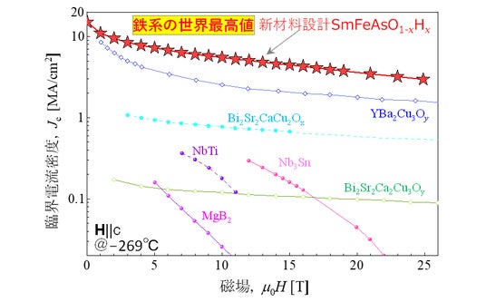 - 新しい材料設計指針により鉄系超伝導材料SmFeAsO1-xHx薄膜を創製し、液体ヘリウム沸点温度(マイナス269度)下で鉄系超伝導材料における世界最高の臨界電流密度(電気抵抗ゼロで流せる電流密度)を達成した。