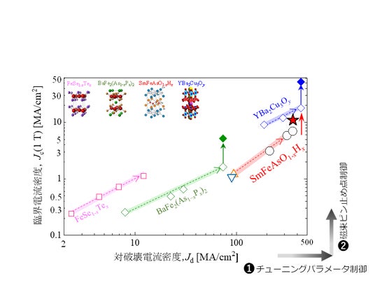 - 本材料設計指針を用いることでSmFeAsO1-xHxとは異なる超伝導材料(YBa2Cu3Oy,BaFe2(As1−xPx)2 , FeSe1-xTex)においても飛躍的な臨界電流密度向上に成功。今後、本材料設計指針が幅広い超伝導材料の臨界電流密度向上に大いに貢献することが期待される。