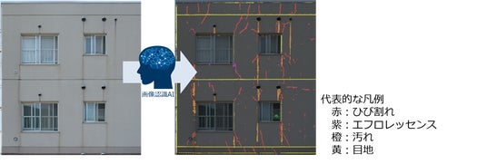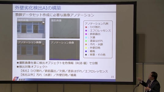 支援技術は、建築物の外壁を撮影した写真からひび割れや鉄筋露出などの変状箇所をAIに自動検出させようとするものであり、検出結果はCADやCSVなどのデータとして出力可能なものとして構築します。