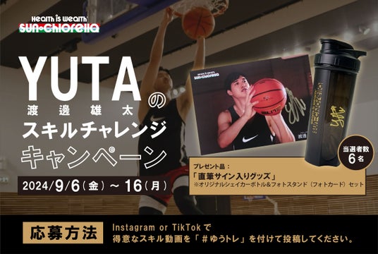 また、直筆サイン入りのオリジナルグッズが当たる「Yutaのスキルチャレンジキャンペーン」を同日の9月6日(金)より開始します。期間中、ご自身の得意なバスケスキル動画を撮影し、「#ゆうトレ」「#サンクロレラ」を付けてInstagramもしくはTikTokに投稿すると、抽選で6名様に渡邊選手の直筆サイン入り、オリジナルシェイカーボトルとフォトスタンドセットが当たります。今回渡邊選手がレクチャーしたスキルや、ご自身のオリジナルプレーなど、動画の内容に指定はございません。ご自身のSNSアカウントよりご投稿ください。