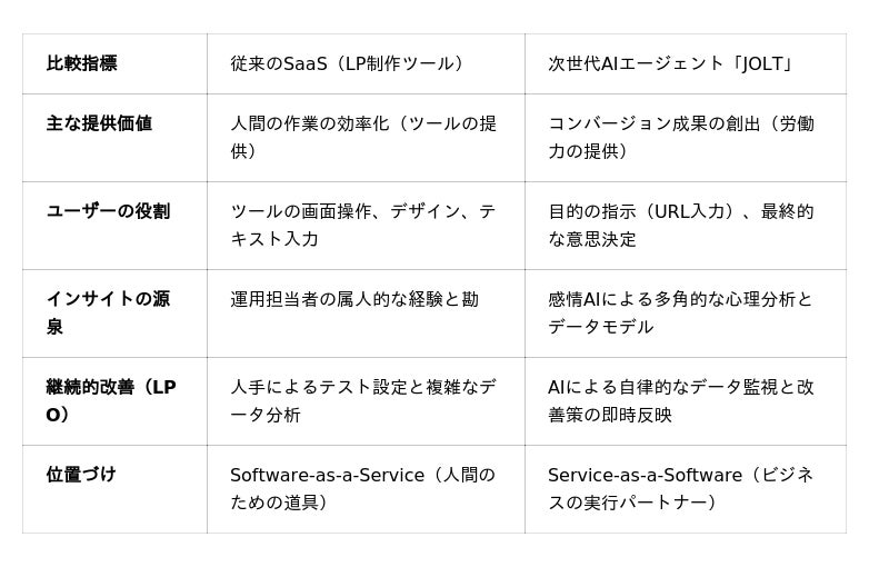 ■従来型SaaS(制作ツール)と次世代AIエージェント「JOLT」の比較