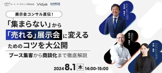 売上アップを仕組みで実現するCRM「Kairos3(カイロススリー)」を提供するカイロスマーケティング株式会社(本社:東京都渋谷区、代表取締役:佐宗 大介、以下「カイロスマーケティング」)は、有限会社ビディア(本社:東京都港区、代表取締役:酒井 統史、以下「ビディア」)、モード・マーケティング株式会社(本社:東京都港区、代表取締役:森田 光一、以下「モード・マーケティング」)との共催にて、オンラインセミナー「展示会コンサル直伝!『集まらない』から『売れる』展示会に変えるためのコツを大公開 ~ブース集客から商談化まで徹底解説~」を8月1日(木)に開催いたします。