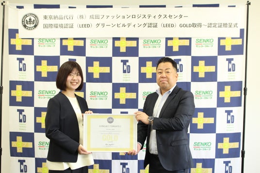(授与式写真:左から弊社 LEED O+Mコンサルタント 高橋 奈穂美、東京納品代行株式会社 取締役 常務執行役員 嶋田 亮司)