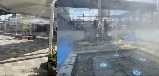 東大阪市におかれては、快適で魅力あふれる都市空間の創出を目的として、俊徳道駅前交通広場の改良工事を令和6年7月より進められてきました。バス待機所や鉄道間をつなぐシェルターにミストを設置す