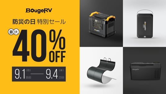 ISSYZONE JAPAN株式会社(本社:東京都台東区、取締役社長:王冲衡、以下「ISSYZONE JAPAN」)が取り扱うアウトドア生活ソリューションを提供するブランドである「BougeRV」(日本語読み:ボージアールブイ)は、2024年の防災の日に向けて、ポータブル電源、ポータブル冷蔵庫、ソーラーパネルなどの人気商品を最大40%オフでご提供いたします。非常時に備えるためのこのチャンスをお見逃しなく。期間は、2024年9月1日(日)0:00~2024年9月4日(水)23:59です。詳細は当社のAmazonストアページをご覧ください。