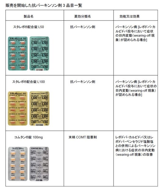 オリオンファーマ・ジャパン株式会社(本社:東京都千代田区、代表取締役社長:小川充則、以下「オリオンファーマ」)は、抗パーキンソン剤3品目(販売名:「スタレボ(R)配合錠L50」および「スタレボ(R)配合錠L100」、「コムタン(R)錠100mg」、以下「当該製品」)につきまして、本日より販売を開始いたしました。