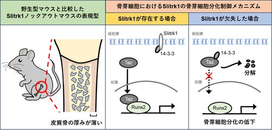 以上の結果から、骨芽細胞に発現するSlitrk1が14-3-3タンパクと結合することでTazのタンパクの分解が制御され、骨芽細胞の分化をコントロールしていることが示唆されました(図)。