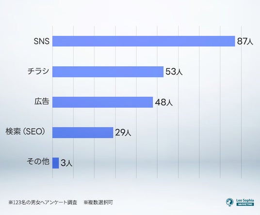 次いで多かったのが「チラシ」(53人)で、中には「新聞」を活用するなど、地域密着型のマーケティング手法が用いられていることが分かりました。新聞折込やポスティングを活用したチラシ配布は、デジタルツールになじみのない年配層にもアプローチしやすくなります。