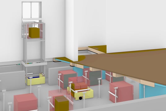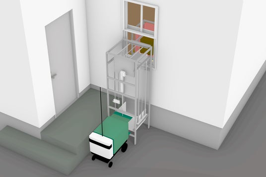 ドローンによる宅配サービスが始まった際に、屋根などに設置される荷物お届け場所(ドローンの着陸場所)と室内とを繋ぐエレベーターです。ドローン宅配は、フードデリバリーなど「軽いものを、即時に受け取り」というサービスが想定されることから、バッファーとなる床下ロボット収納は必須ではありません。