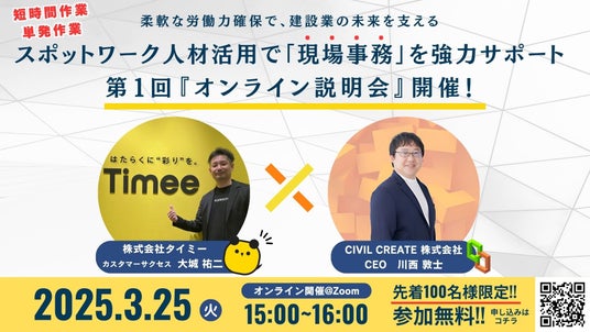 CIVIL CREATE株式会社(本社:千葉県船橋市、代表取締役:川西 敦士)と株式会社タイミー(本社:東京都港区、代表取締役:小川 嶺)は、建設業界における慢性的な人材不足の解決に向け、業務提携契約を締結いたしました。本提携を通じて、短時間・単発のスポットワーク人材を活用した建設業の「現場事務」支援を実現し、生産性向上と業界の労働力確保に貢献してまいります。