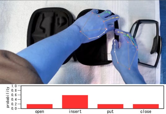 骨格追跡AIユーザーインターフェース例(紙をバッグに挿入(insert)する作業の追跡画像)