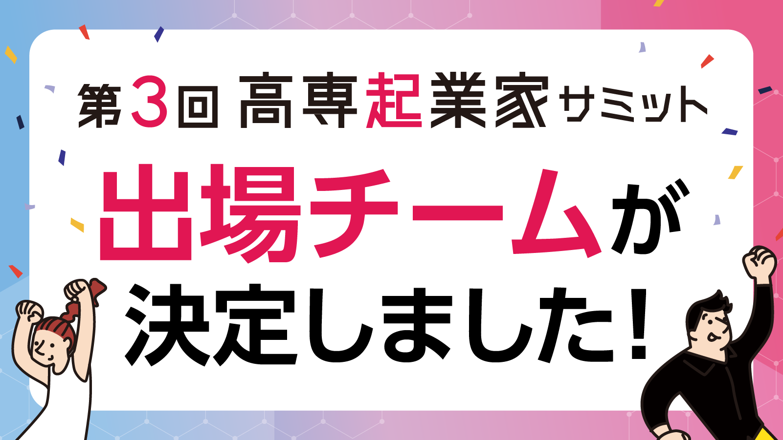 独立行政法人国立高等専門学校機構(東京都八王子市、理事長:谷口功)と月刊高専(運営:メディア総研株式会社(本社:福岡県福岡市、代表取締役社長:田中 浩二))が主催する「第3回高専起業家サミット」の出場チームが決定しました。