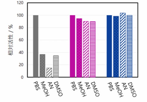 図3.アメーバハイドロゲルによって保護された酵素(β-ガラクトシダーゼ)の有機溶媒中における酵素活性(グラフ中央・赤、グラフ右・青)は、ハイドロゲルなし(黒)を顕著に改善。PBS:リン酸緩衝液、MeOH:メタノール、AN:アセトニトリル、DMSO:ジメチルスルホキシド。(グラフ中央・赤:酵素とハイドロゲルポリマーを直接共有結合、グラフ内右・青:酵素とハイドロゲルポリマーをスペーサー分子を介して共有結合)